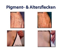 Dies geschieht über eine Lichtbestrahlung des Pigmentfleck mit einer an den Hauttyp angepaßten Energie, welche nur in den dunklen Farbpigmenten absorbiert(verschluckt) wird.